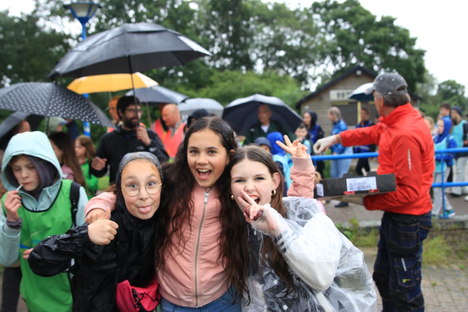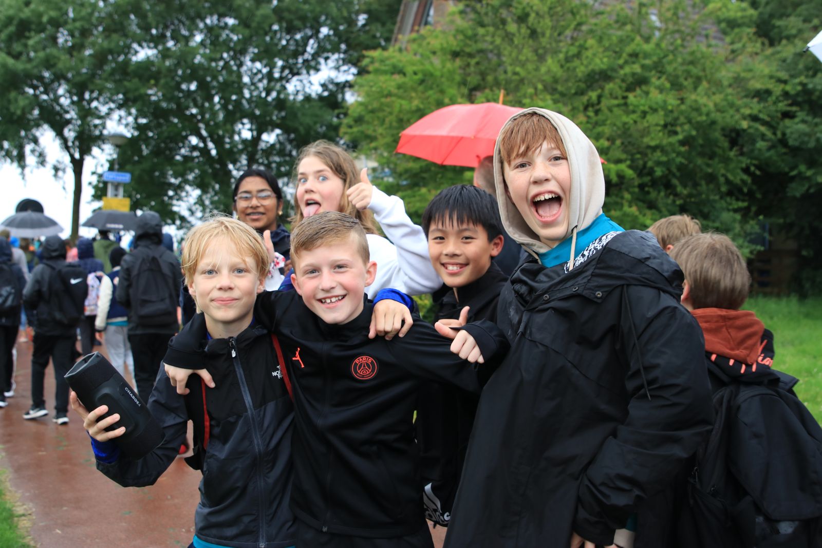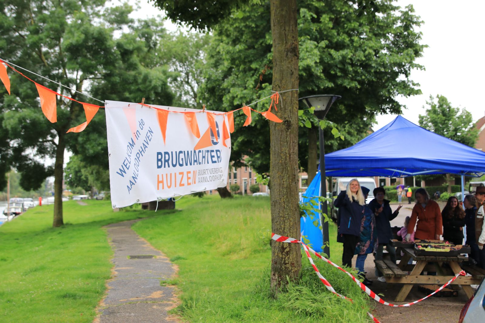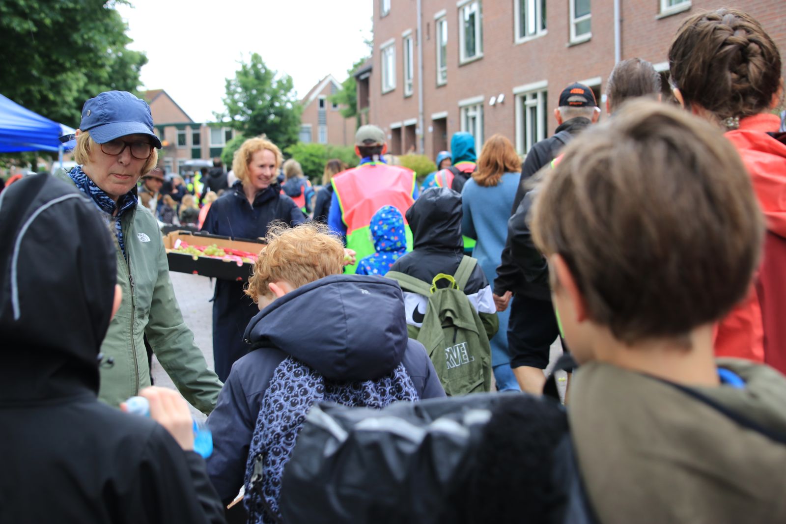 Een gezellige stoet wandelaars komt langs en over de ophaalbrug