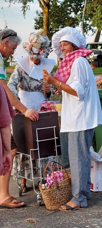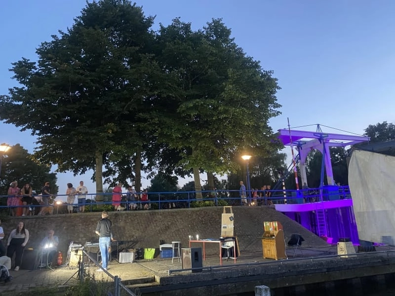 De Buurtvereniging Aanloophaven staat voor verbinding. Een spel waarbij onbekenden aan elkaar werden gekoppeld mocht dus niet ontbreken. Jurko van Veenendaal startte het optreden van de Theaterroute met het toepasselijke lied ‘Bridge over troubled water’ waarna hij samen met de Huizense Tamar Floor een aantal jaren 70 songs vertolkte. Jurko en Tamar werden begeleid door pianist Mark Lippe. Inmiddels was de zon onder en werd de Aanloophaven sprookjesachtig verlicht. Vanaf het Gooimeer kwamen steeds meer boten met navigatieverlichting de Aanloophaven binnen. Acteur Howard van Dodemont had de eer een eerste tipje van de sluier van de Theaterroute 2023: ‘De roerige jaren 70’ op te lichten. Howard ging een dialoog aan met een film die op de ophaalbrug was opgenomen. De Brugparade werd afgesloten door de Gooise DJ’s die lekkere muziek vanuit hun Volvo Amazone draaiden. De buurt rond de ophaalbrug in Huizen is tijdens de Brugparade weer een beetje meer verbonden!