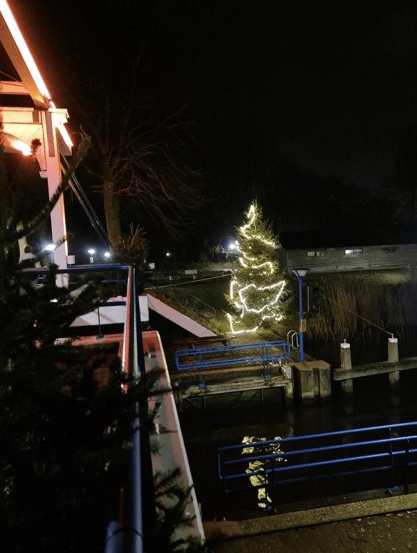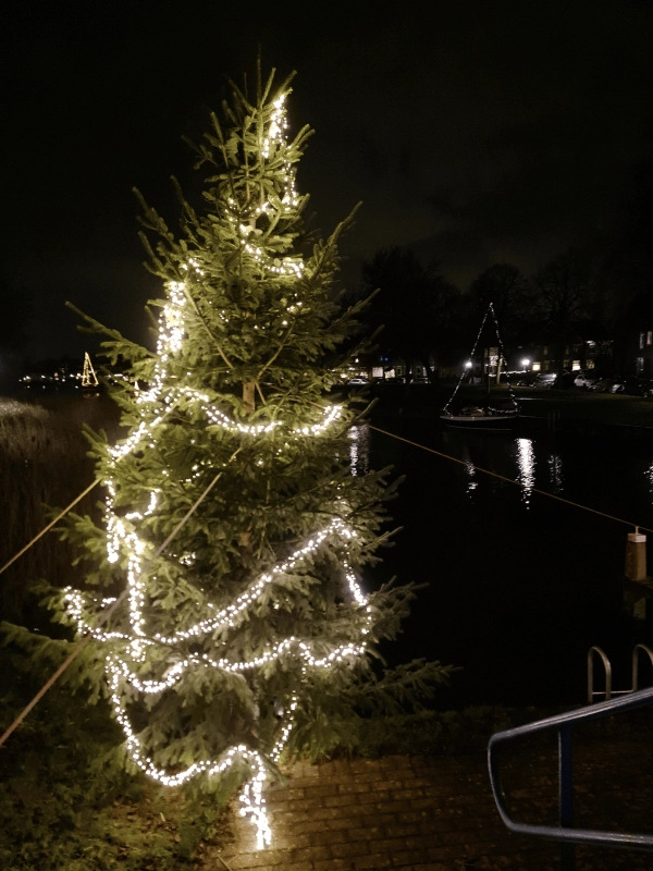De grote kerstboom schittert weer naast de brug, zichtbaar vanuit vele woningen aan de Westkade en de vanaf de Griend. En het is ook een leuk uitzicht voor alle wandelaars. Ook de 12 kerstbomen die we van Ranzijn hebben gekregen voor het feest, geven een kerstsfeer aan onze mooie omgeving.