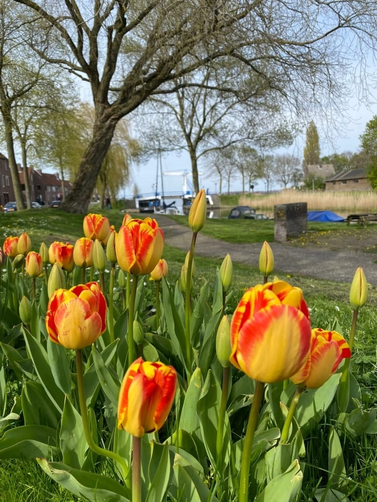 Laat in het najaar van 2022 hebben we met de buren een strook gras omgeturnd tot tulpenveld. Wat een prachtgezicht! 300 tulpenbollen bij de kruising Eem, Westkade langst de aanloophaven.